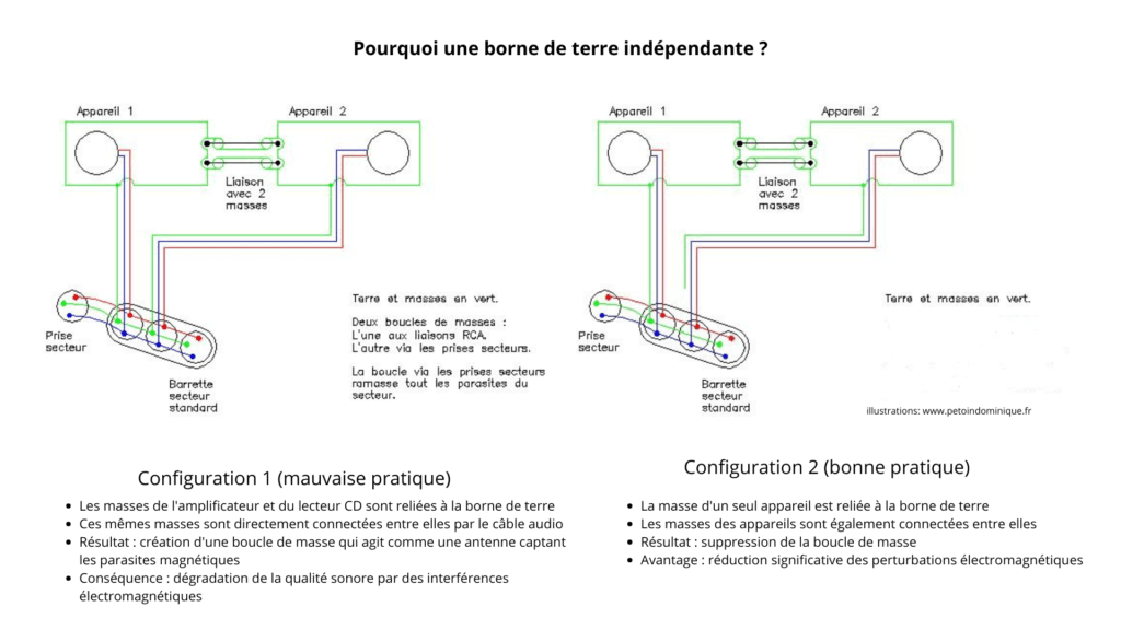 La configuration 1, avec deux appareils reliés à la terre et entre eux, crée une boucle parasite captant les interférences magnétiques, dégradant ainsi la qualité sonore.