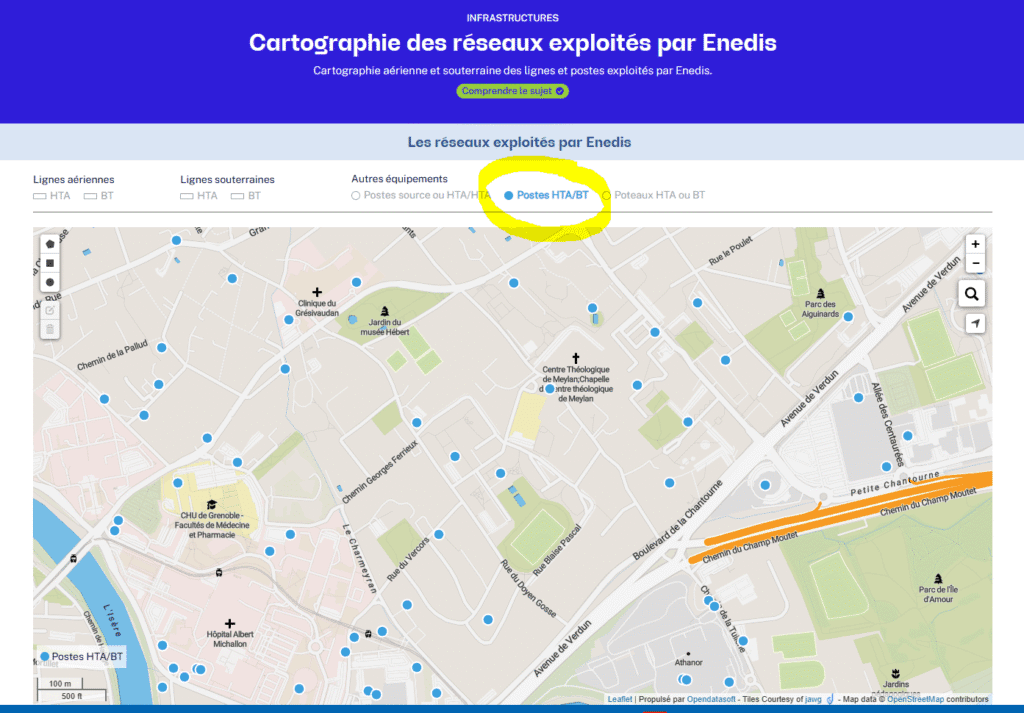 Recherchez votre adresse puis sélectionnez « Postes HTA/BT ». Chaque point bleu correspond à un transformateur !