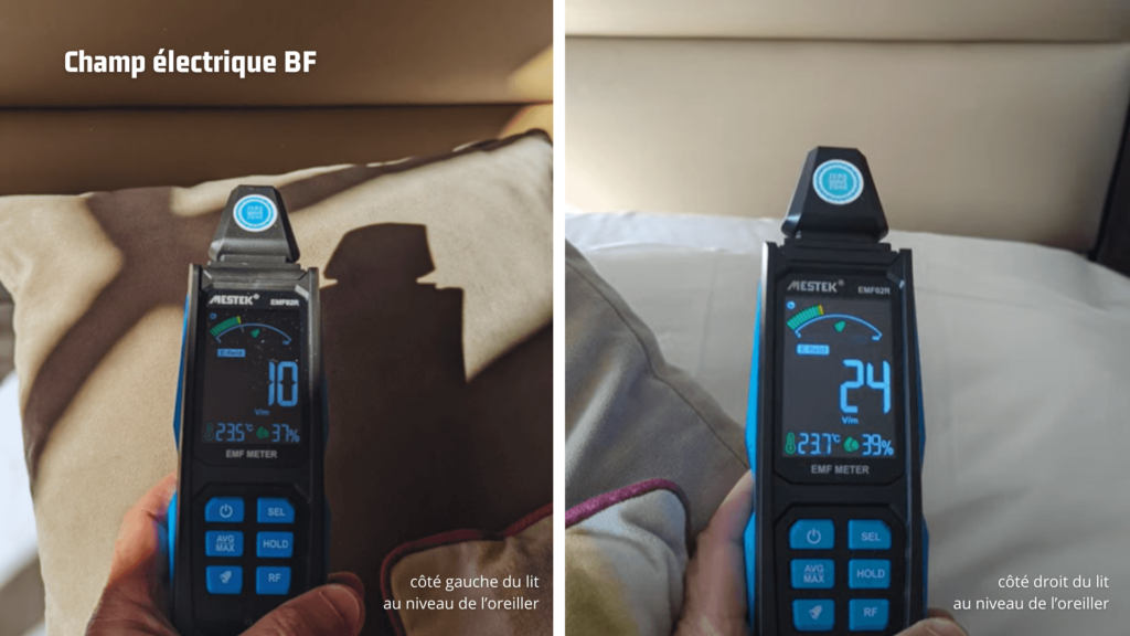 Les résultats furent sans appel: la différence de pollution électrique entre nos côtés du lit était flagrante. Là où je dormais paisiblement exposé à un champ électrique BF de 10 V/m (la limite supérieure pour « bien dormir »), elle devait supporter un niveau de 24 V/m !